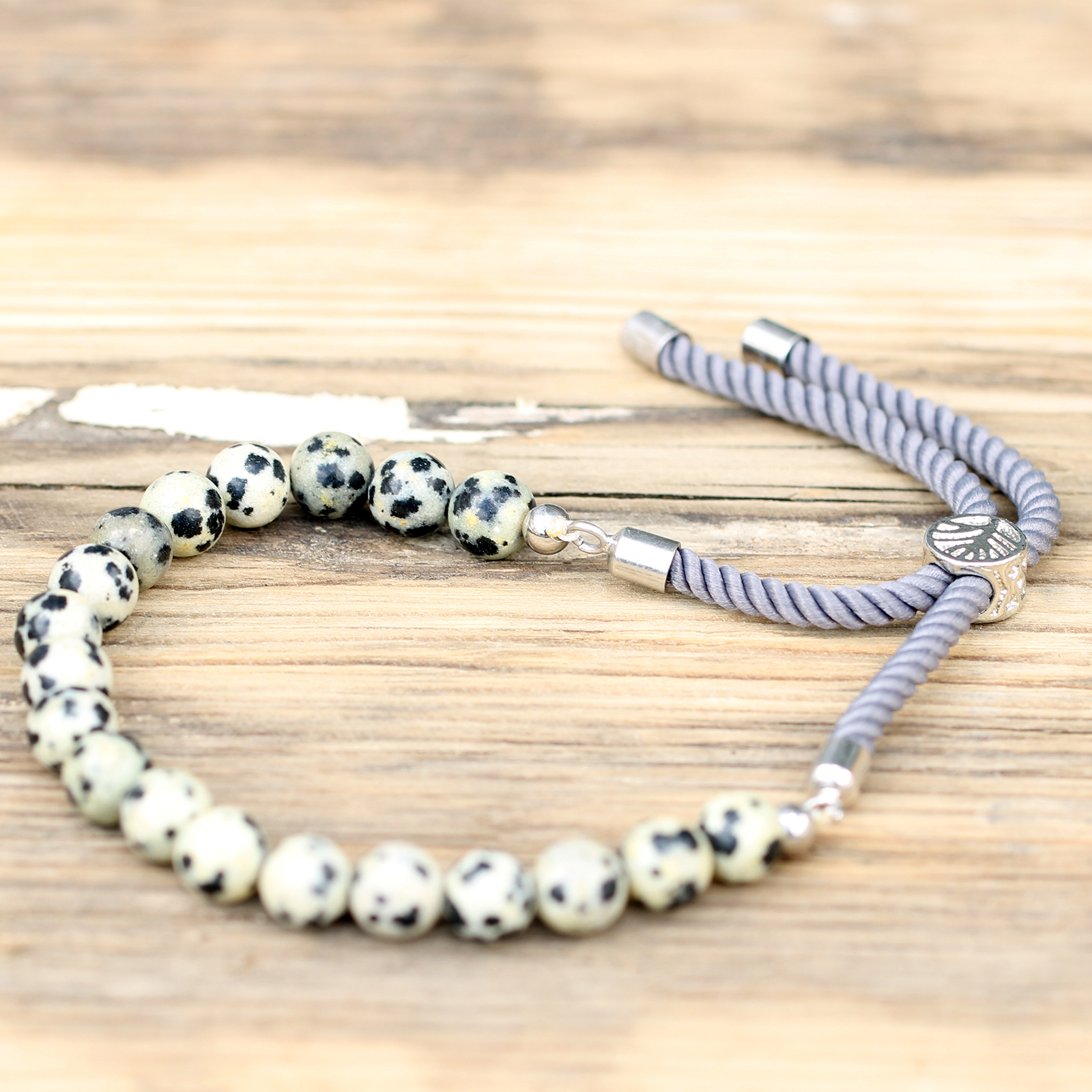 925 Silver Plated Gemstone Charcoal String Bracelet – Dalmatian Jasper