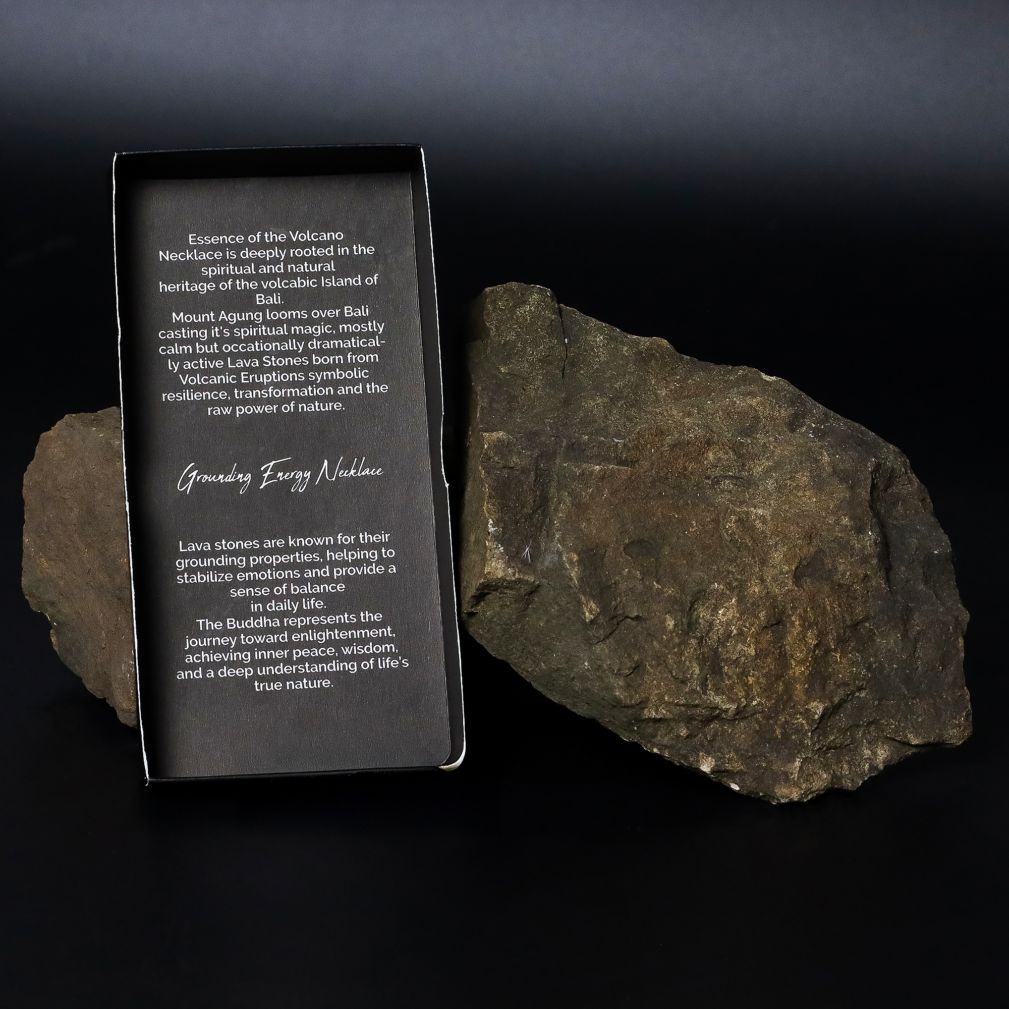 Handcrafted in Bali from natural lava stone, the Grounding Energy Necklace from the Essence of the Volcano Collection combines meaningful symbolism with striking shelf appeal