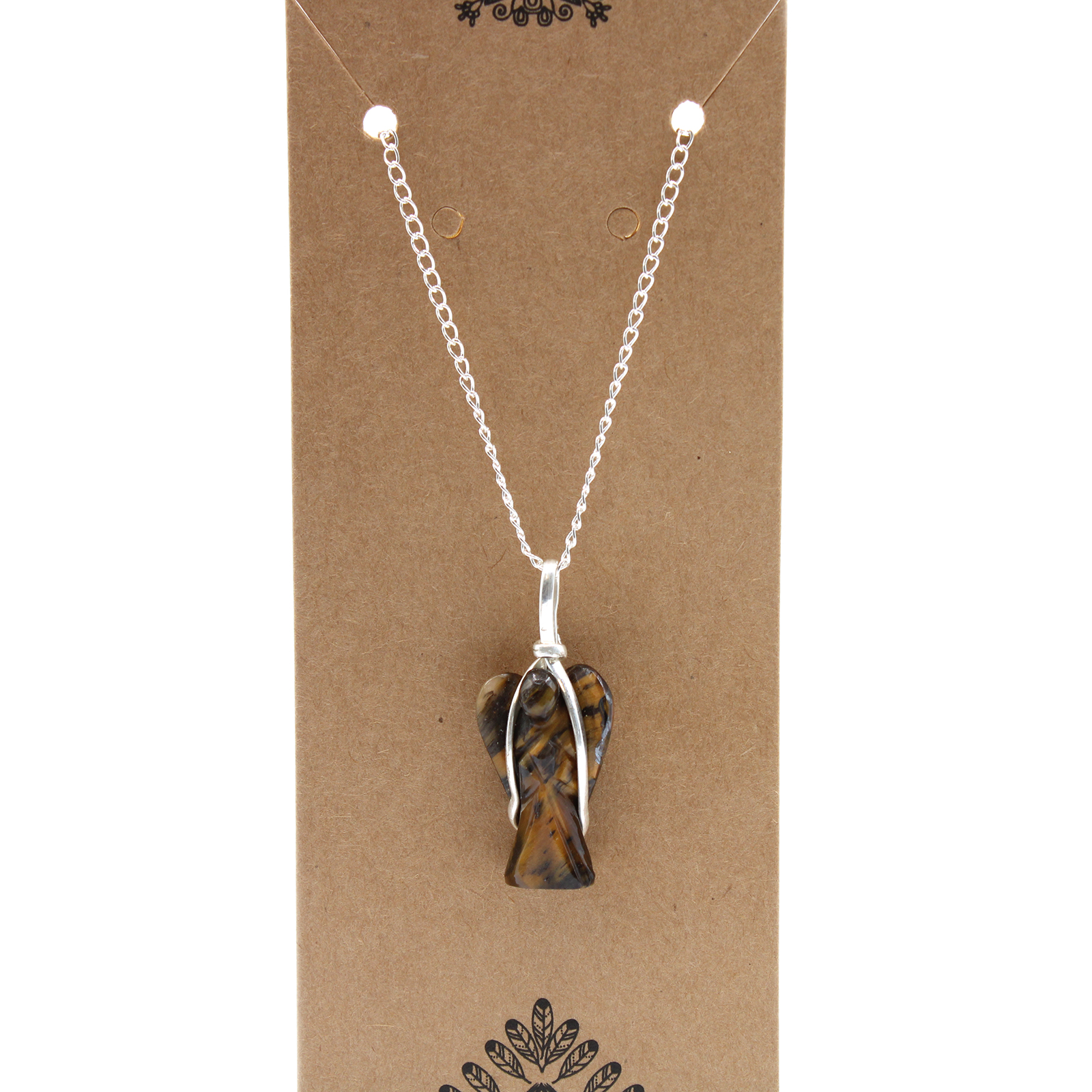 The Gemstone Guardian Angel Pendant features a polished Tiger Eye gemstone in the shape of a delicate angel