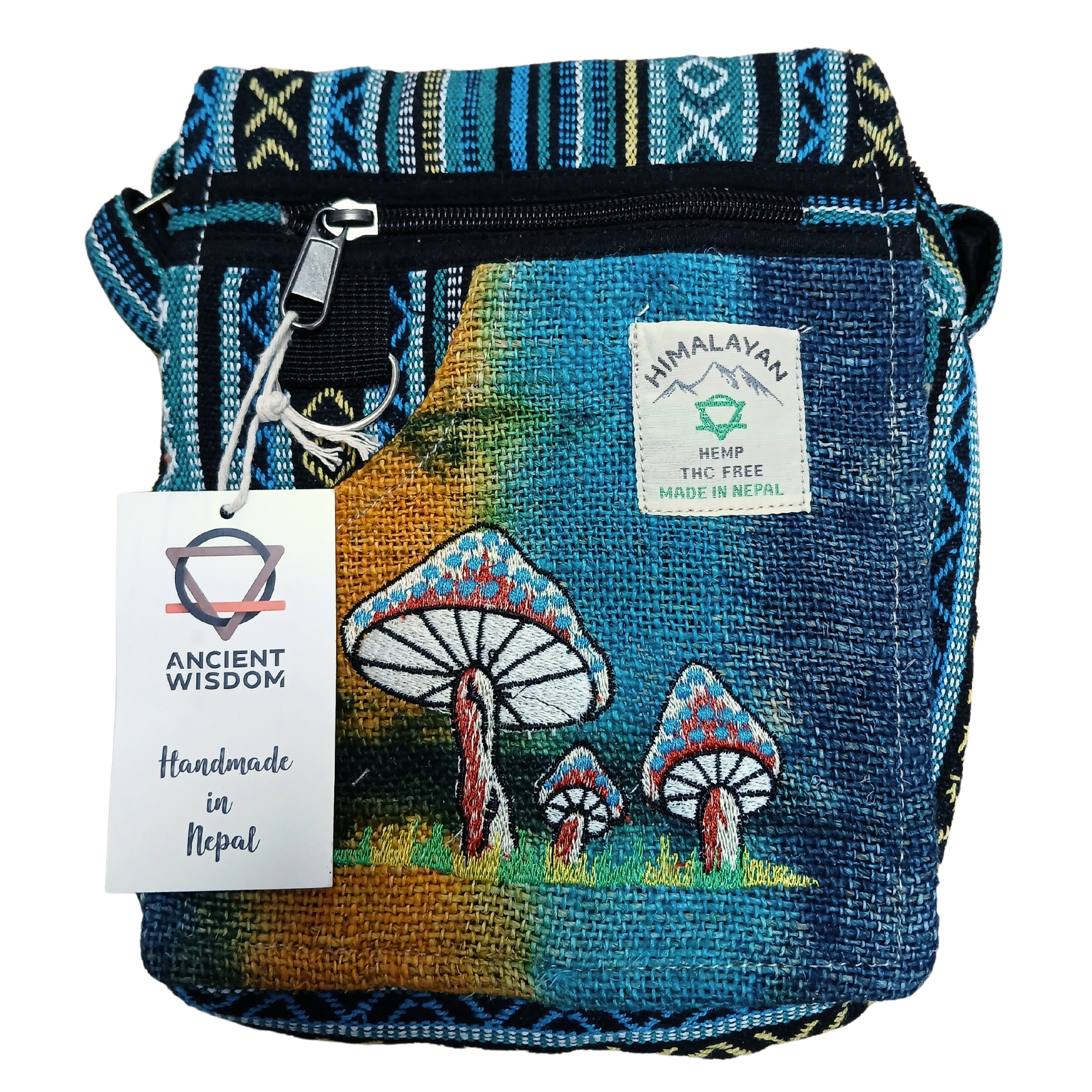 The Hemp Embroidery Mushroom Party Bag with Green Mushrooms is a charming, eco-friendly accessory made from 100% hemp and natural cotton