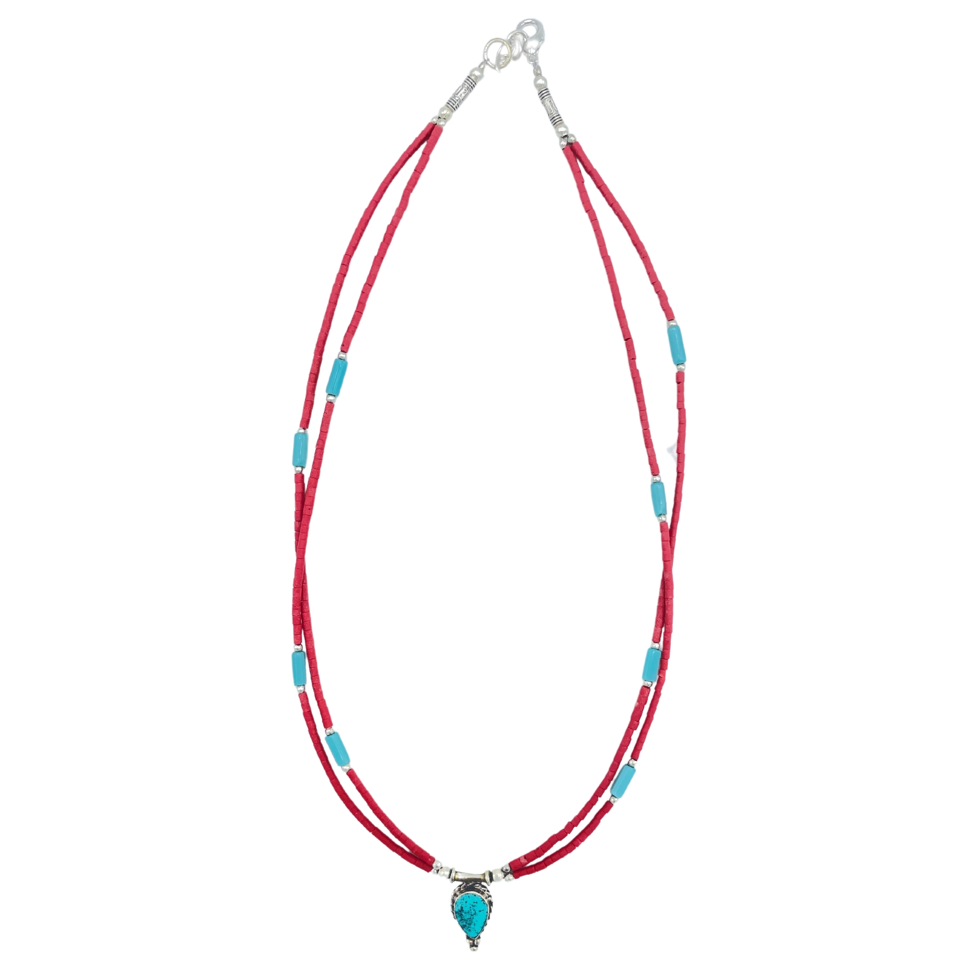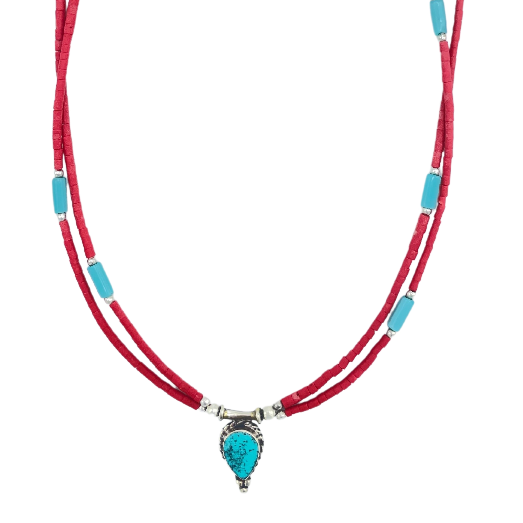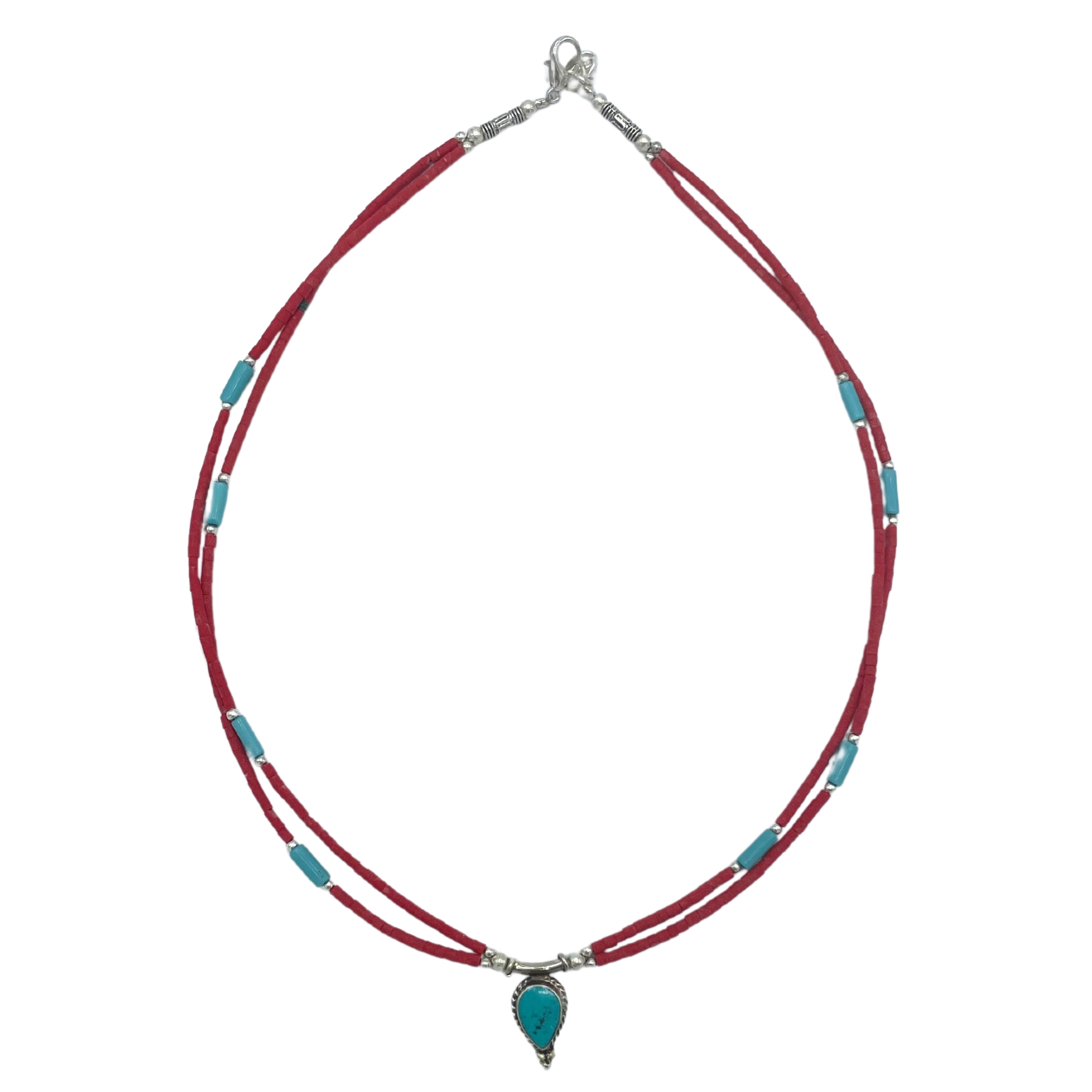 Nepalese Extra Fine Two Line Necklace – Pink & Turquoise Pendant