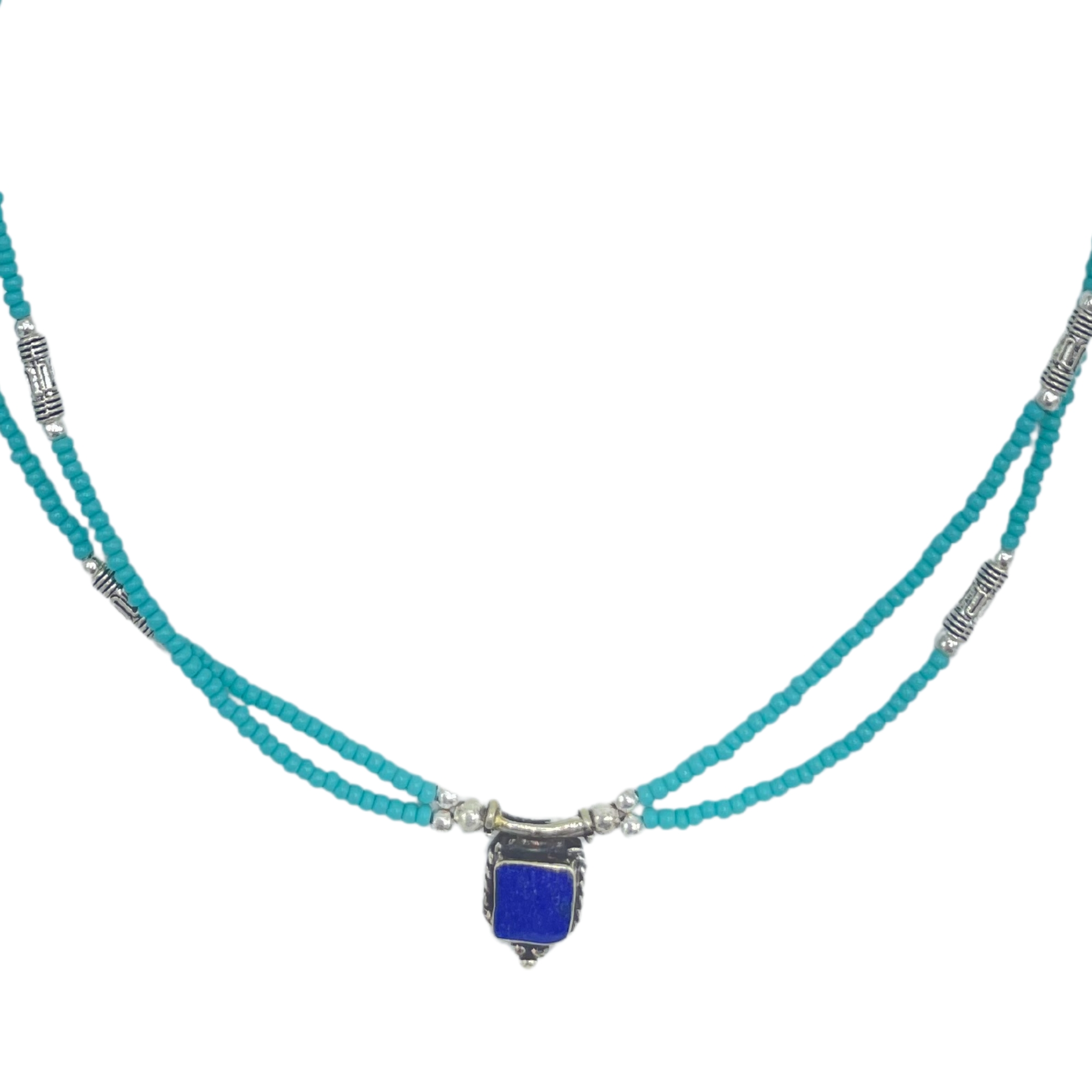 Nepalese Extra Fine Two Line Necklace – Turquoise & Lapis Pendant