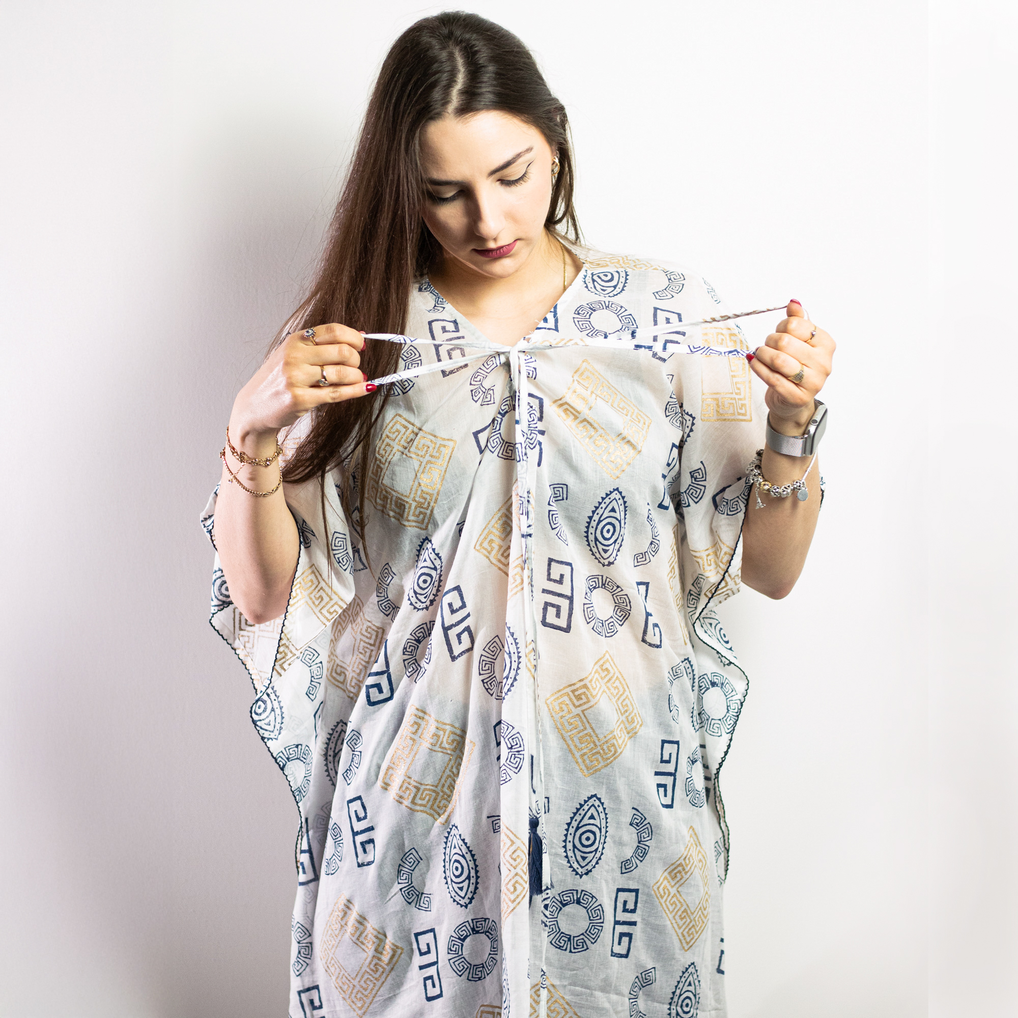 Artisan-Made, Hand-dyed and carefully handpainted with classic Greek motifs – no two kaftans are exactly the same