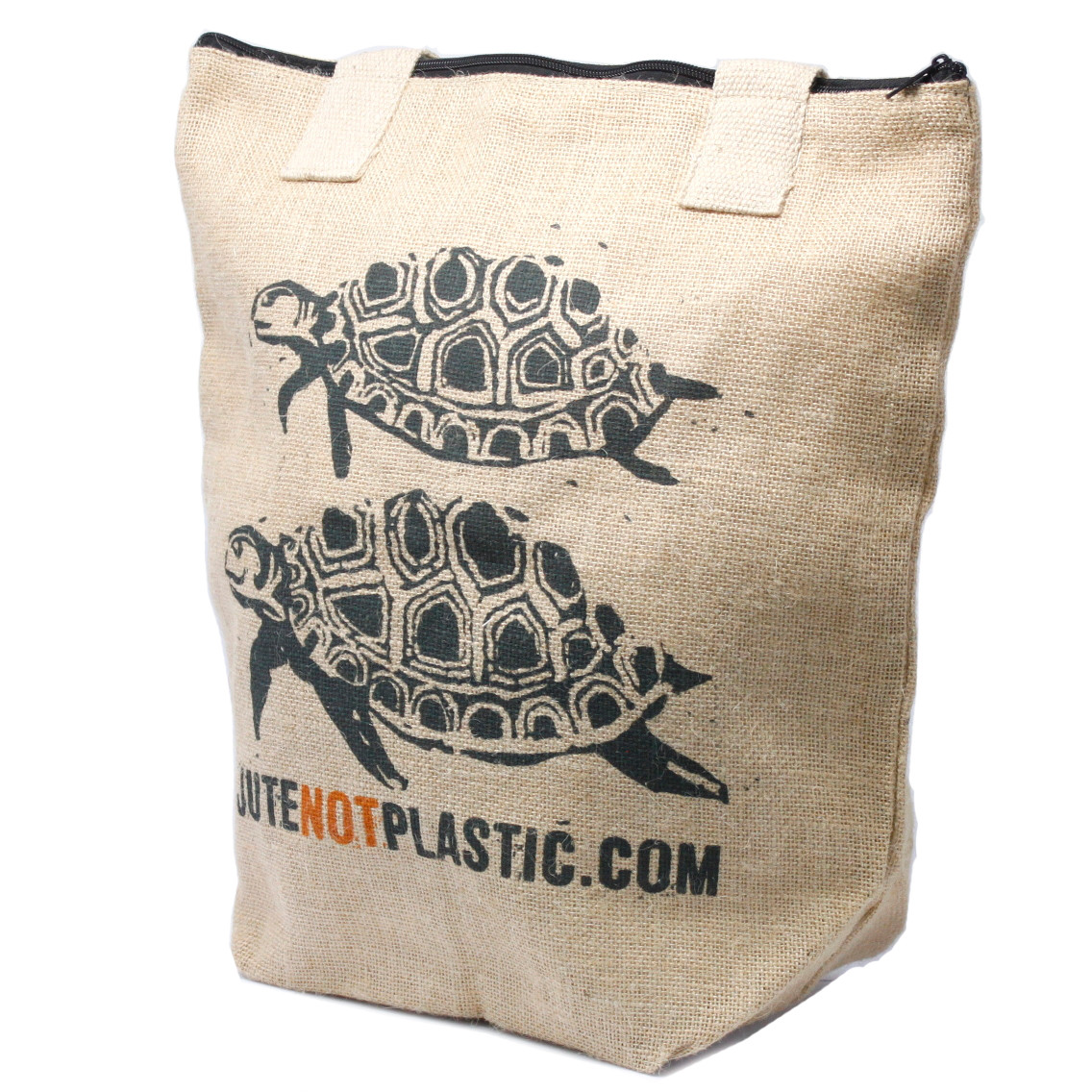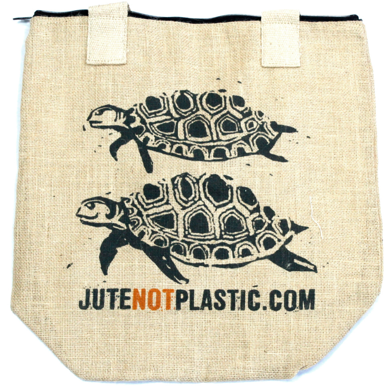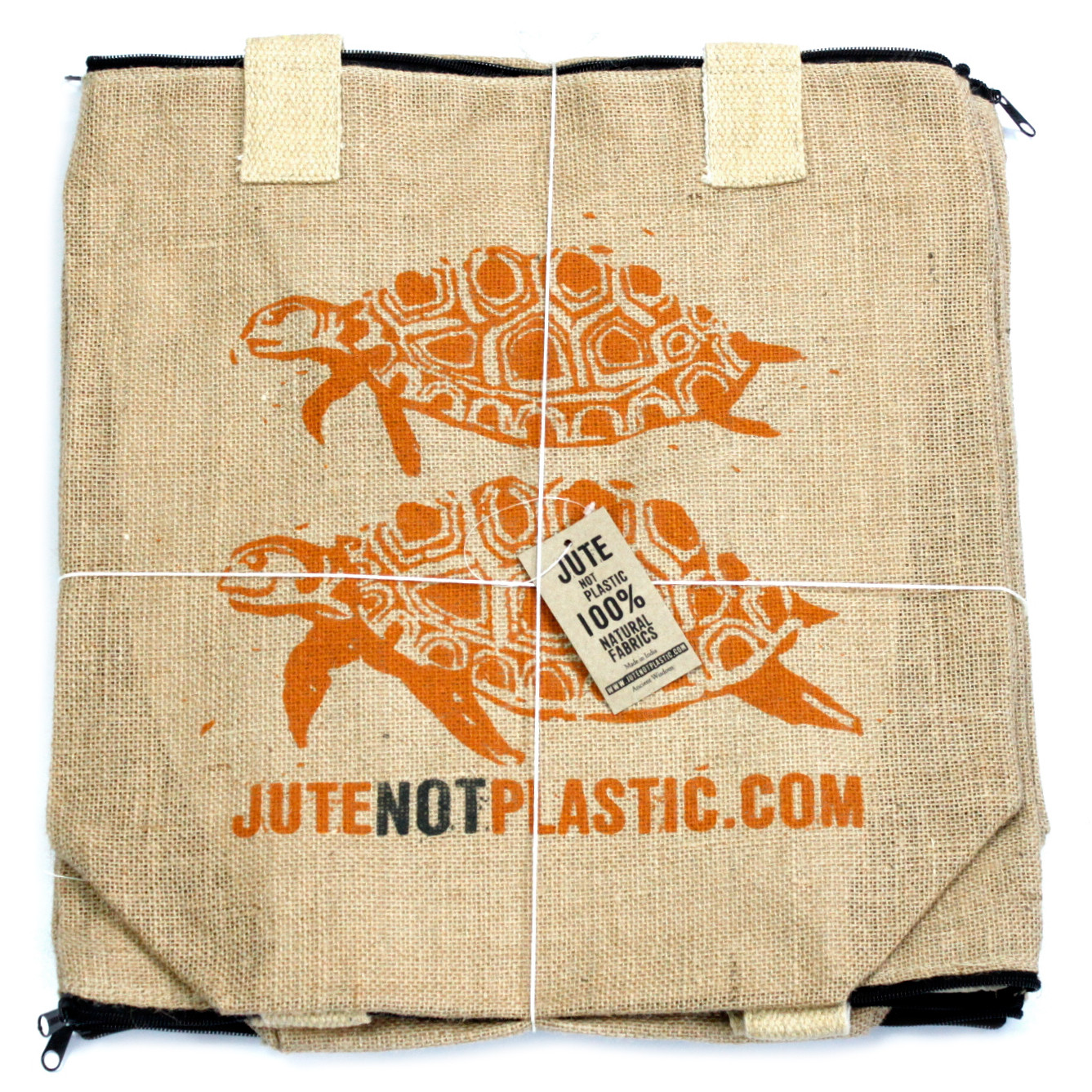 These eco bags come in a choice of 2 colours: Orange and Black, and feature the Two Turtles image and the JuteNotPlastic